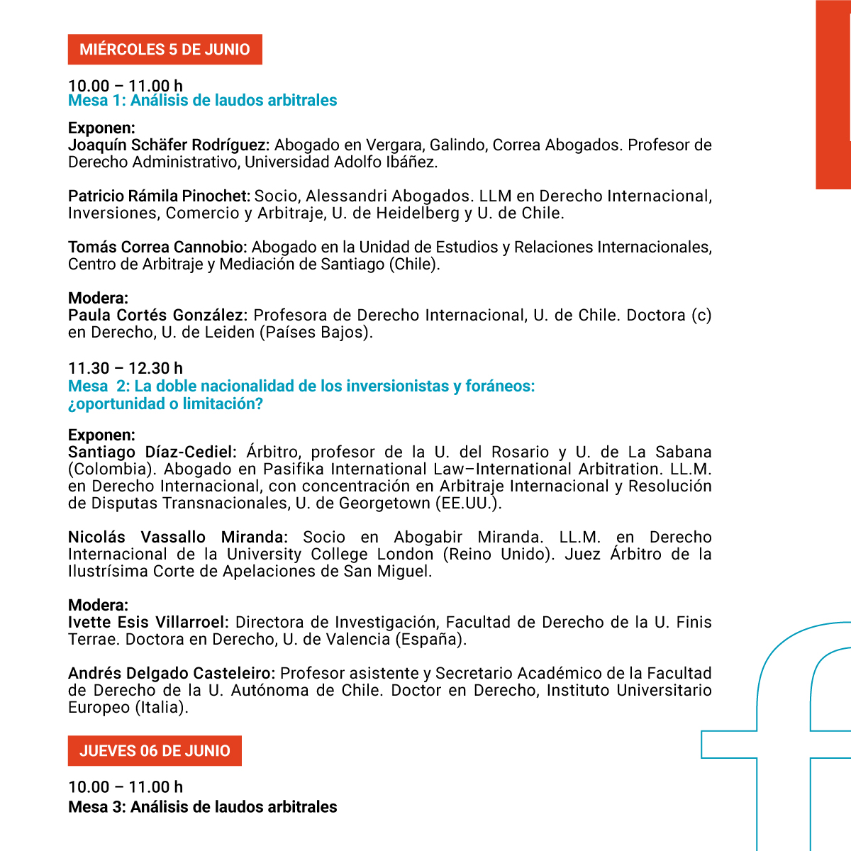 Este miércoles 5 y jueves 6 de junio, de 10:00 a 12:30 h, se realizará en dependencias de la Facultad de Derecho de la Universidad Finis Terrae el seminario “Revisión de laudos de inversión 2023: 5° encuentro anual”, evento desarrollado de manera híbrida y organizado por dicha casa de estudios en conjunto con la Facultad de Derecho de la Universidad Autónoma de Chile.